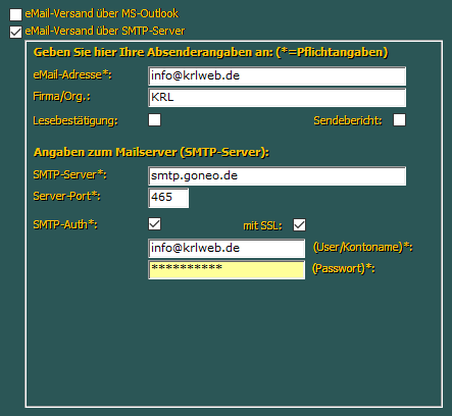 Wir empfehlen im Ausstellungsprogramm folgende Einstellungen beim versenden der eMails per SMTP-Server aus den Ausstellungsprogrammen heraus.