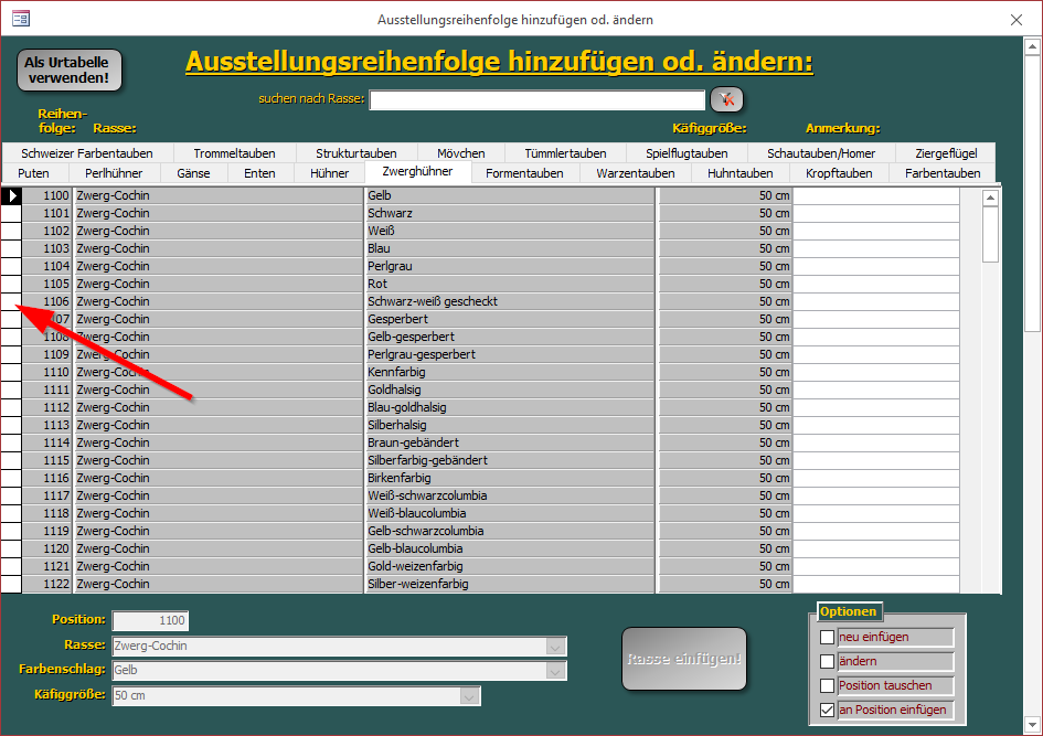 Im Beispiel soll "Zwerg-Cochin Gelb" nach "Zwerg-Cochin Rot" eingefügt werden. Um dies zu erreichen klicken wir auf den Datensatzmarkierer der Rasse-/Farbekombination unterhalb von "Zwerg-Cochin Rot", dies ist "Zwerg-Cochin Schwarz-weiß gescheckt".